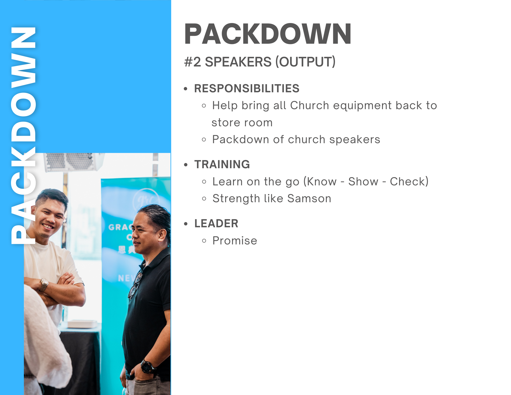 Setup/Packdown Team: Working behind the scenes to make sure church is set up to run smoothly every week.